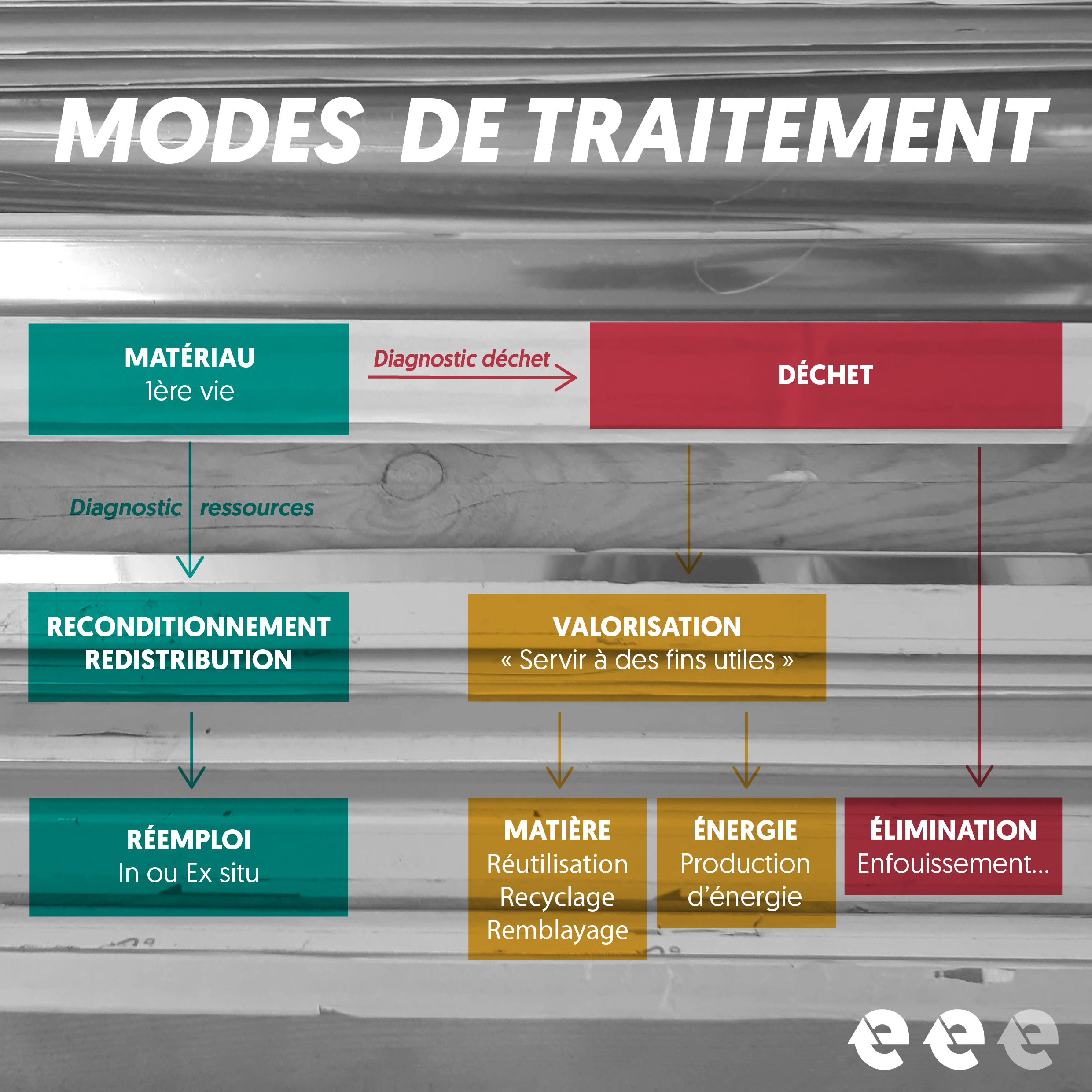 Les filières de valorisation matière et énergétique sont ensuite à envisager puis l’élimination, en dernier recours. Les définitions suivantes sont extraites de l’Article L541-1-1 du Code de l’environnement :