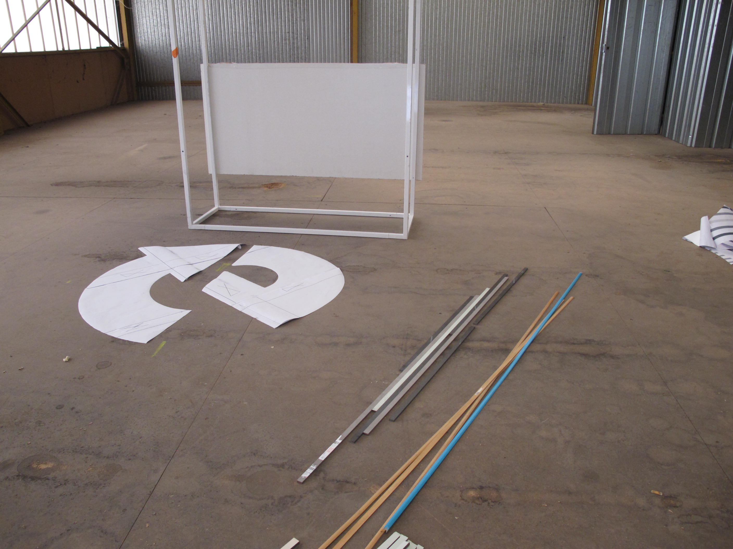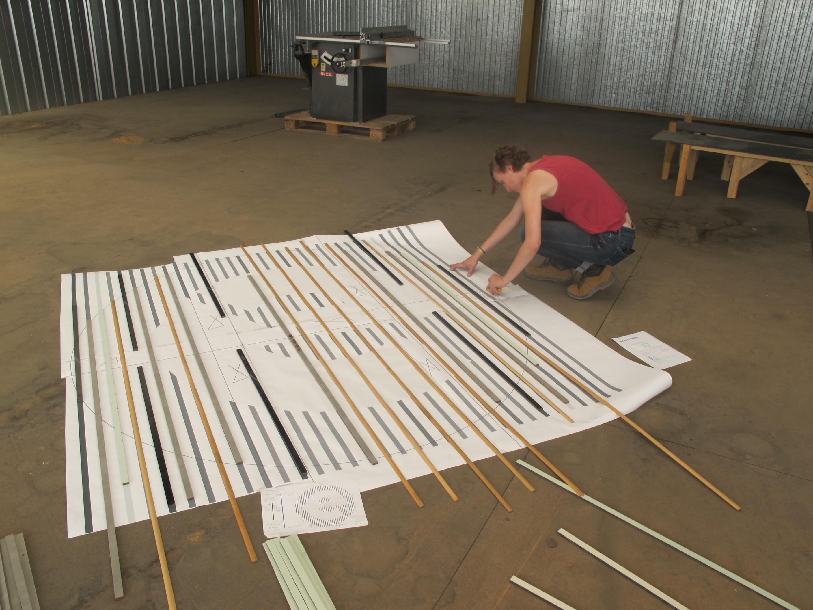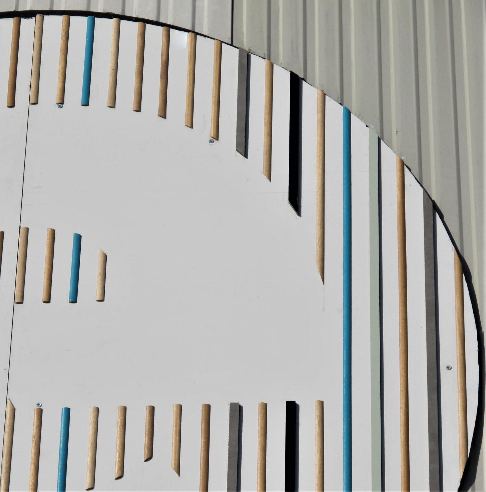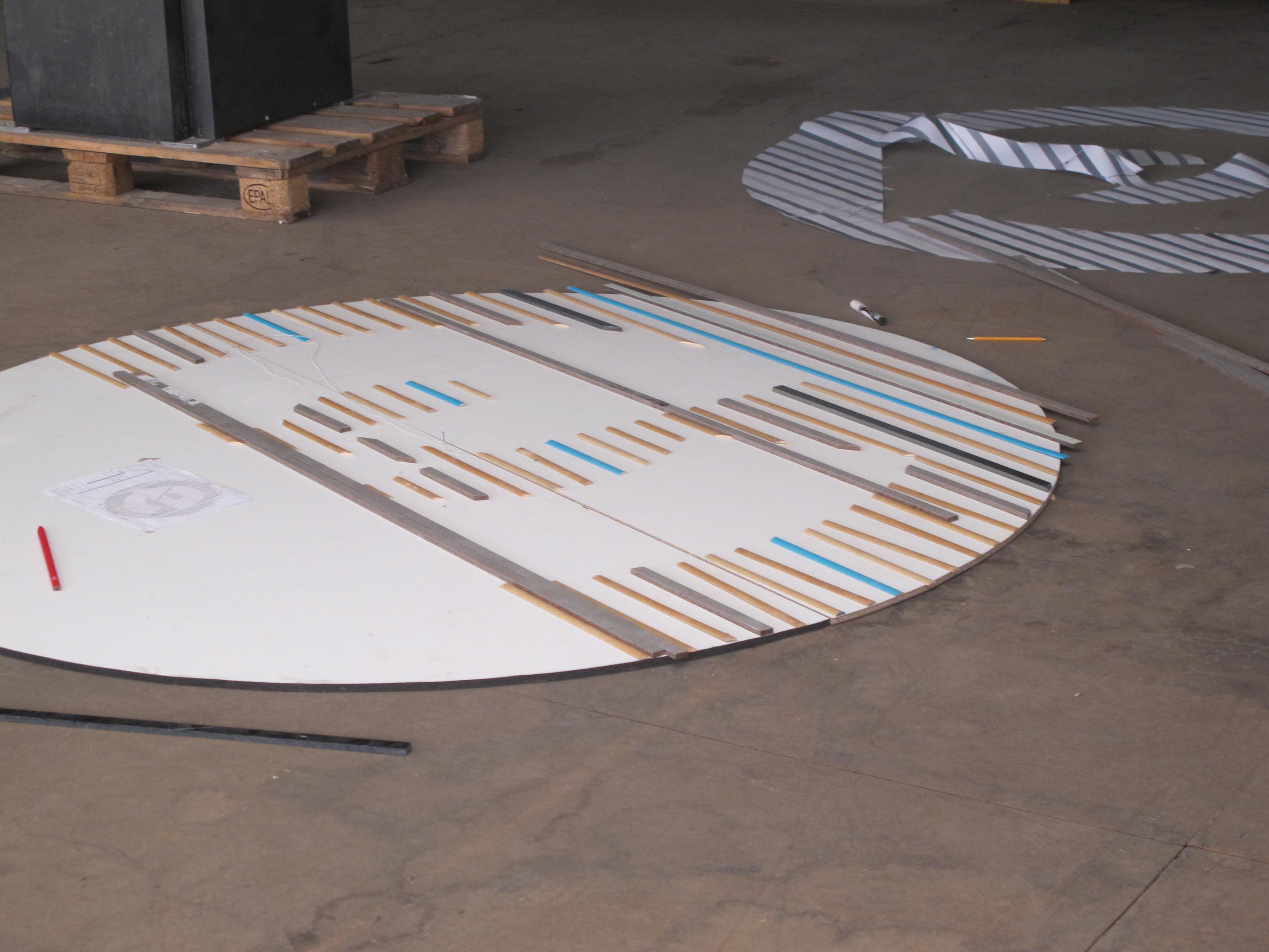 Une fois n’est pas coutume, nous avons puisé dans les matériaux en stock pour le concevoir. Ici, il s’agit de chutes de bardage de façade, découpées en fine bandes, et de baguettes en bois : des éléments qui étaient dans le stock depuis un bon moment. De plus, faire apparaître le E en négatif nous a finalement permis d’utiliser assez peu de matière !