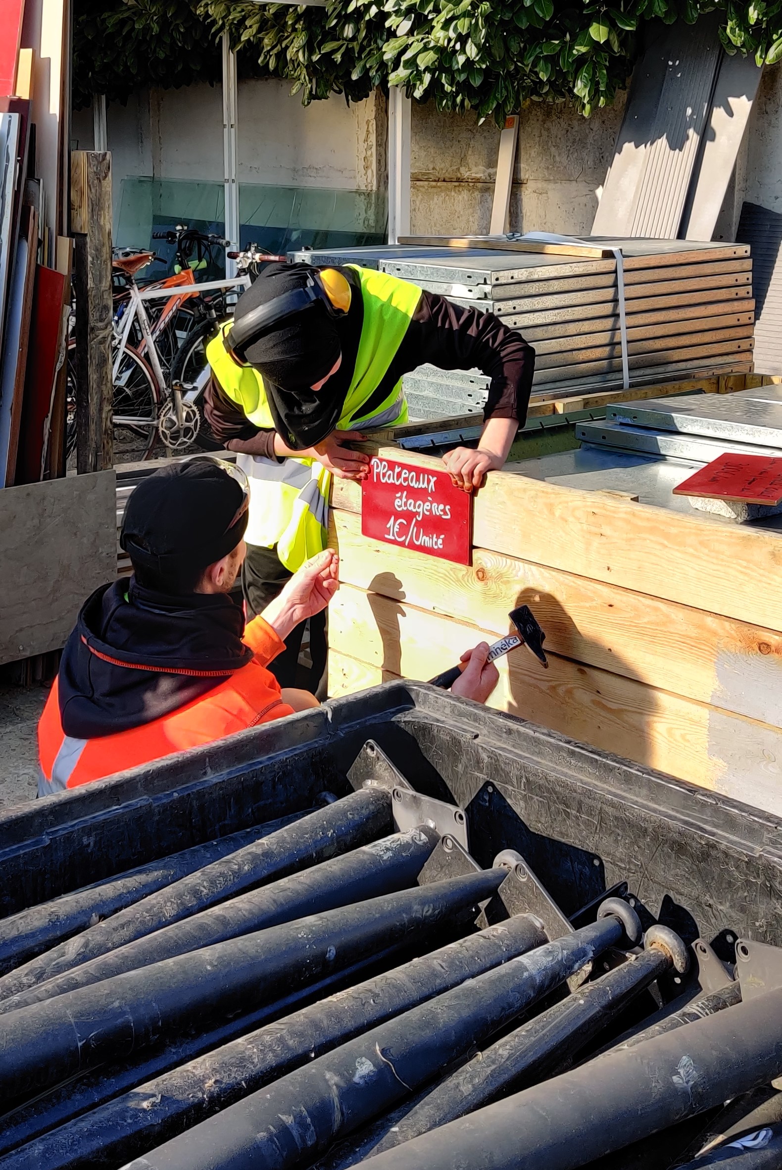 – protection des racks extérieurs : après avoir collecté beaucoup de bois en octobre, nous l’avons trié et rangé par type de section. Pour continuer à le stocker en extérieur sans qu’il ne s’abîme, nous avons conçu des couvertures amovibles en polycarbonate (lui-même collecté par Minéka). Le bois reste ainsi au sec et conserve ses qualités !