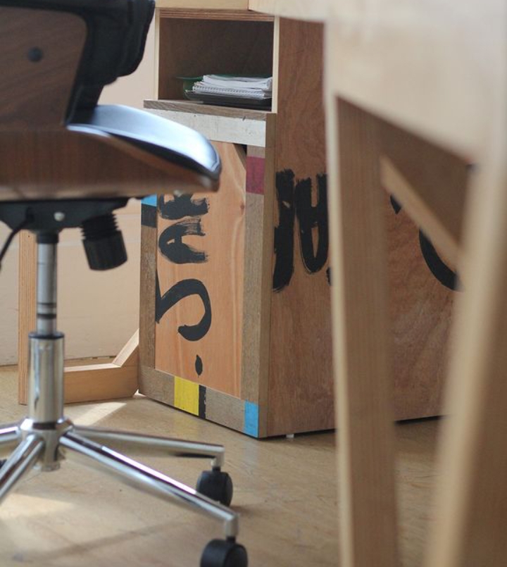 Les pieds sont issus d’établis d’artisans maroquiniers. Le caisson, lui, est fabriqué à partir d’anciens décors du Tnp Villeurbanne, comme en témoignent les marquages techniques encore visibles.