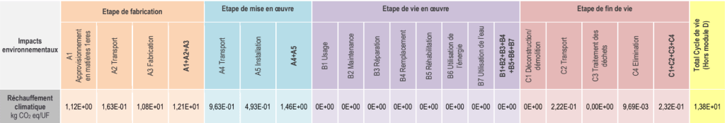 Pour calculer les émissions évitées, il nous suffit donc d’ajouter les indicateurs de réchauffement climatique donnés par l’ACV de la base INIES sur les étapes A1 à A4, C3 et C4.