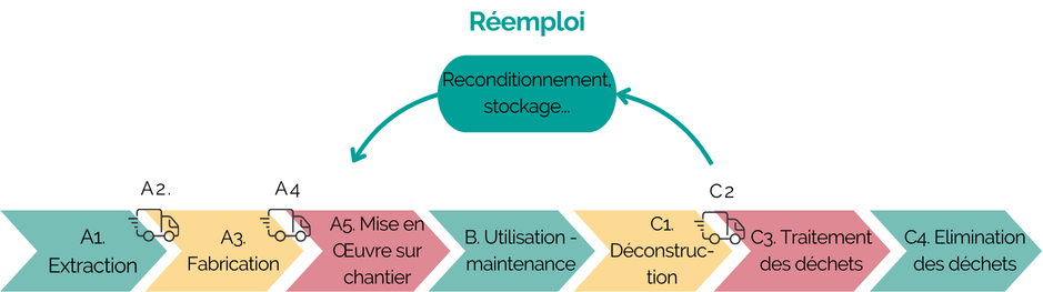 Le réemploi permet de ne pas avoir à traiter ni à éliminer le déchet (C3 et C4). De plus, le produit réemployé ne génère pas d’extraction de nouvelles matières premières, de fabrication ou de transport entre ces étapes (A1 à A4).